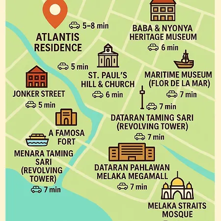 Atlantis Residence @ Melaka apartment is approximately a 10-minute drive from Menara Taming Sari. The apartment has a fully furnished kitchen, which comes complete with a microwave oven, an electric kettle and a dishwasher.